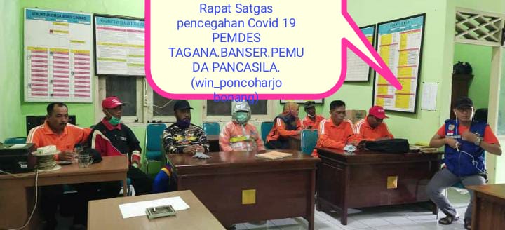 Pada hari senin tanggal 30 Maret 2020 pukul 08.30 WIB bertempat di Balai Desa Pancoharjo Kecamatan Bonang, relawan Tagana Desa Poncoharjo (Setyawan Win Winarto) juga sebagai petugas/gugus tugas Desa Poncoharjo mengikuti rapat Satgas Pencegahan dan Penanganan COVID-19 yang diselenggarakan oleh Pemerintah Desa Poncoharjo Kecamatan Bonang.