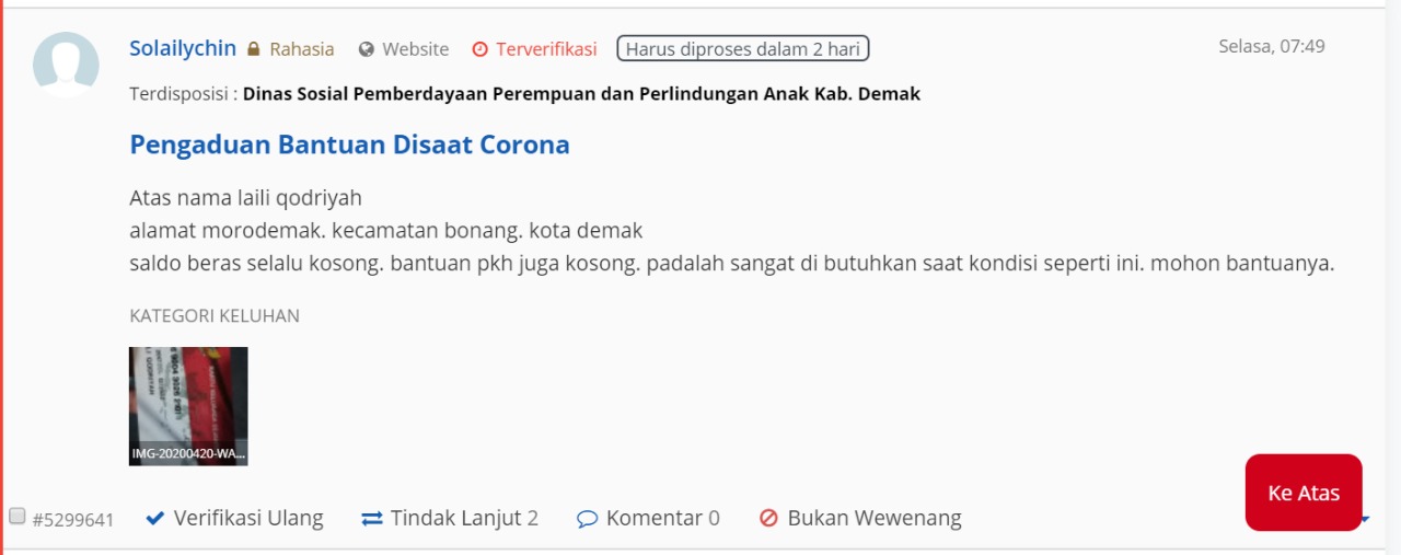 Pengaduan melalui Laporgub pada Selasa, 21 April 2020 oleh warga atas nama Laili Qodriyah dari Desa Morodemak Kecamatan Bonang yang mengaku sebagai KPM PKH. Laili Qodriyah (32) merupakan KPM PKH asal Desa Morodemak dengan status kepesertaan PKH aktif sampai dengan Penyaluran Tahap 2 Tahun 2020. Kepesertaan PKH atan nama Laili Qodriyah telah masuk dalam Surat Perintah Pencairan Dana (SP2D) sebagai alokasi Bantuan Sosial PKH Tahap 2 Tahun 2020. Sehingga masih menerima bantuan Tahap 2 Tahun 2020 yang disalurkan di bulan Maret 2020 dengan nominal yang diterima sebesar Rp 975.000 dan akan menerima bantuan tambahan sebesar 25% dalam rangka penanganan dampak COVID-19 yang sasarannya ditentukan berdasarkan Penerima Tahap 2 Tahun 2020 tersebut akan disalurkan bulanan pada bulan April, Mei, dan Juli 2020 ini dengan nominal bantuan yang diterima adalah Rp 325.000/bulan.