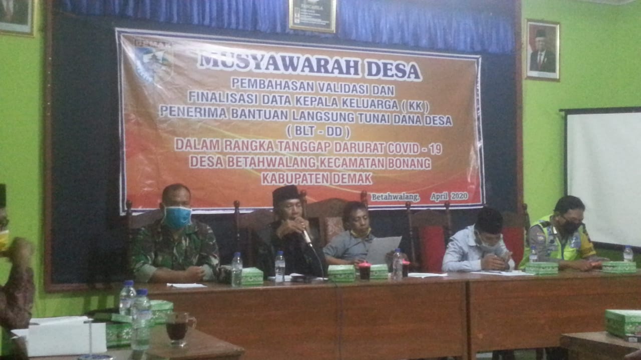 Pada dari Selasa tanggal 28 April 2020 pukul 20.30 WIB bertempat balai Desa Betahwalang Kecamatan Bonang, dalam rangka Musyawarah Desa (Musdes) membahas Bansos Validasi dan Finalisasi Data Kepala Keluarga (KK) penerima bantuan BLT Dana Desa, dalam acara ini dihadiri Kepala Desa Betahwalang, perangkat desa, BPD, LKMD, Tokoh Masyarakat, Babinsa, Babinkamtibmas dan TKSK Kecamatan Bonang.