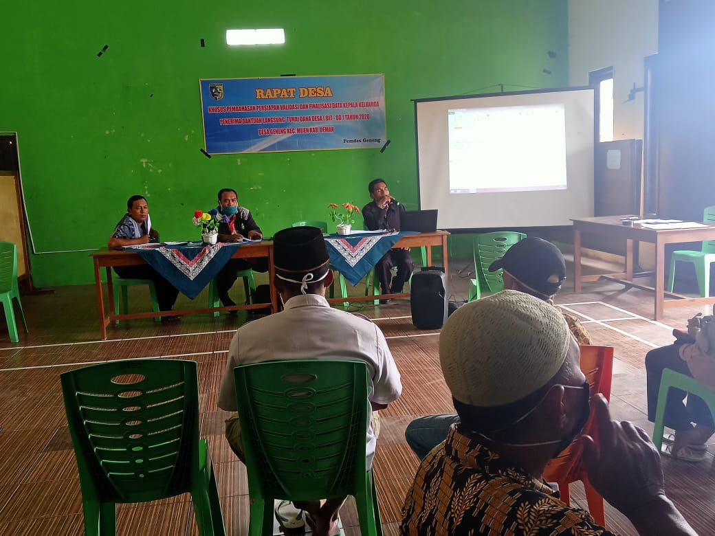 Rapat Desa khusus pembahasan persiapan Validasi dan Finalisasi Data Kepala Keluarga penerima bantuan BLT Dana Desa di Desa Geneng Kecamatan Mijen dalam penanganan dampak covid-19 di Desa Geneng Kecamatan Mijen, hari Selasa 28 April 2020 pukul 10.30 WIB bertempat di Balai desa Desa Geneng Kecamatan Mijen. TKSK Kecamatan Mijen ZAENAL MUZTABA,S.Th.I bersama Kepala Desa, Sekdes, Perangkat Desa, BPD.