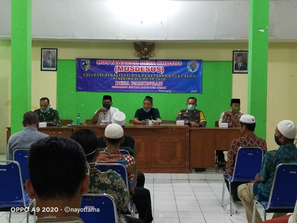 Pada dari Jum’at tanggal 2 Mei 2020 pukul 21.00 WIB bertempat balai Desa Pamongan Kecamatan Guntur, dalam rangka Musyawarah Desa (Musdes) membahas Bansos khusus Validasi, Finalisasi dan Penetapan Data Kepala Keluarga penerima bantuan BLT Dana Desa, dalam acara ini dihadiri Kepala Desa Pamongan, perangkat desa, BPD, LKMD, Tokoh Masyarakat, Babinsa, Babinkamtibmas dan TKSK Kecamatan Guntur.