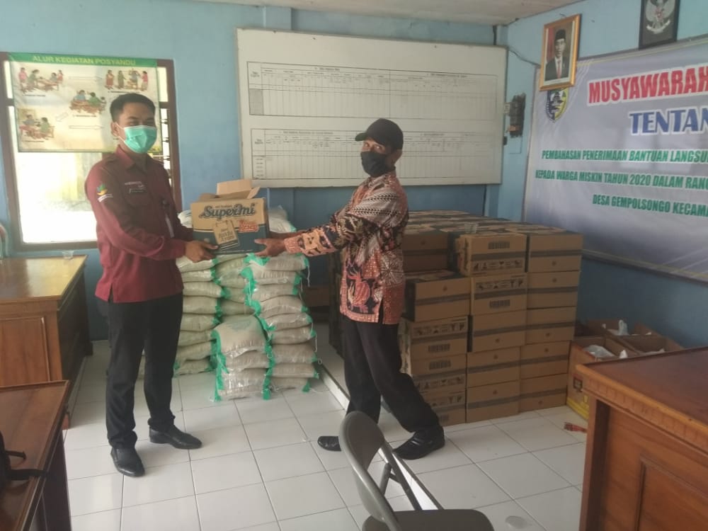 Pendamping Sosial PKH Kecamatan Mijen (KHASAN NADHIF,S.Pd) pada hari Kamis 18 Juni 2020 pukul 11.00 WIB monitoring pendistribusian dan penyerahan  Bansos Jaring Pengaman Sosial (JPS) Kabupaten  bulan ke 2 kepada Perangkat Desa Gempolsongo Kecamatan Mijen, seluruh penerima wajib memakai masker dan cuci tangan sebelum masuk lokasi pengambilan. Program Jaring Pengaman Sosial diberikan untuk membantu keluarga miskin dan rentan di daerah terdampak Covid-19 agar meringankan beban mereka selama pandemi. Desa Gempolsongo Kecamatan Mijen mendapatkan paket sembako JPS Kabupaten untuk bulan ke 2 sebanyak 94 Paket Sembako untuk warga masyarakat yang terdampak COVID-19.