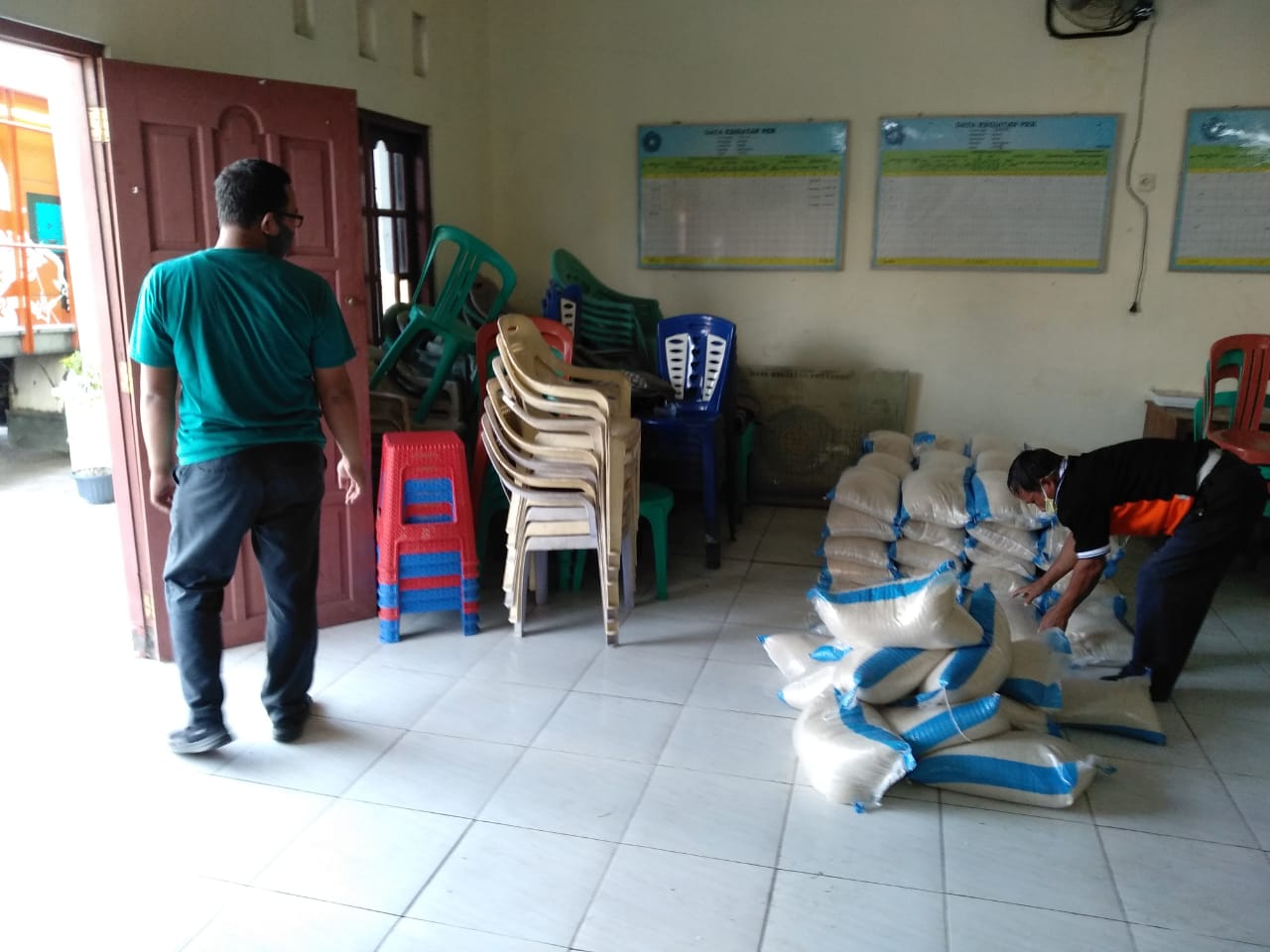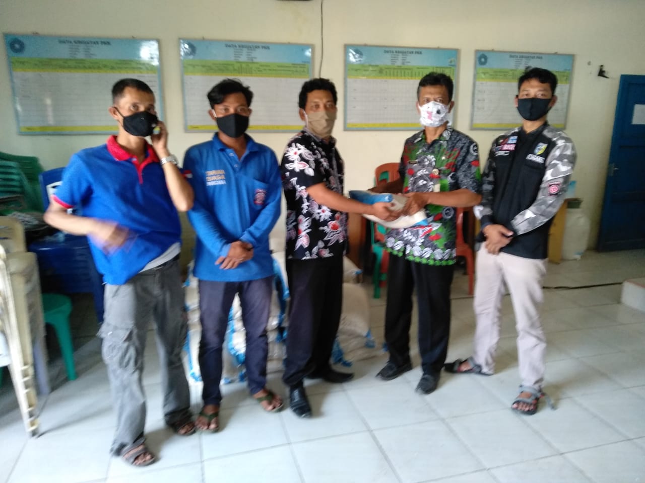 Relawan Tagana Kecamatan Sayung dan Karangawen Kabupaten Demak (Agus Maulana, dan Mustafydz Amma) mendampingi Kepala seksi Perlindungan Sosial Korban Bencana pada Bidang Linjamsos DinsosP2PA Kabupaten Demak (Haryono) atas nama Pemerintah Kabupaten Demak bertempat di balai Desa Bedono Kecamatan Sayung melaksanakan droping dan penyerahan sembako untuk 77 KK (259 jiwa) masyarakat yang terdampak Covid-19 di Desa Bedono Kecamatan Sayung yang berupa beras sebanyak 77 zak dan Mie Instant 77 Dos diterima oleh Perangkat Desa Bedono Kecamatan Sayung pada hari Rabu tanggal 22 Juli 2020 pukul 15.15 WIB. Sembako tersebut diberikan kepada RT yang terdapat warga positif corona, baik yang masih sakit dan sudah sembuh, dikarantina.