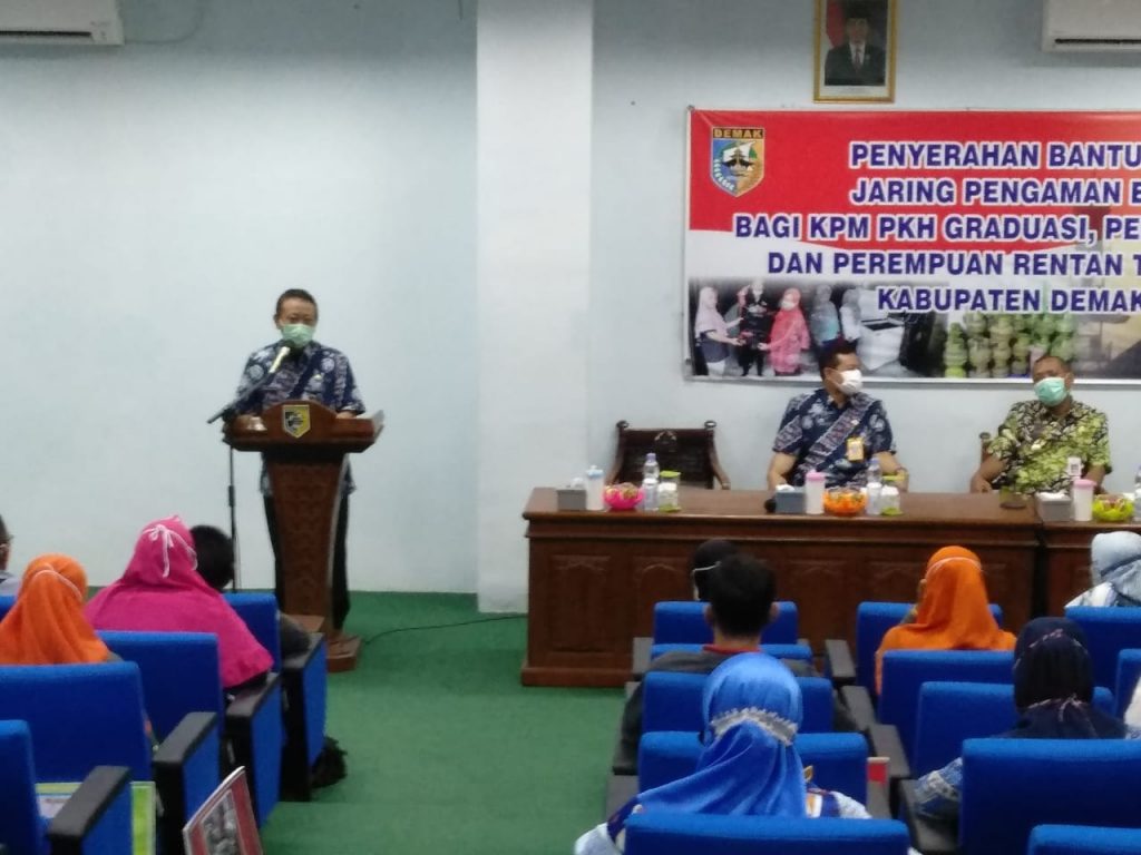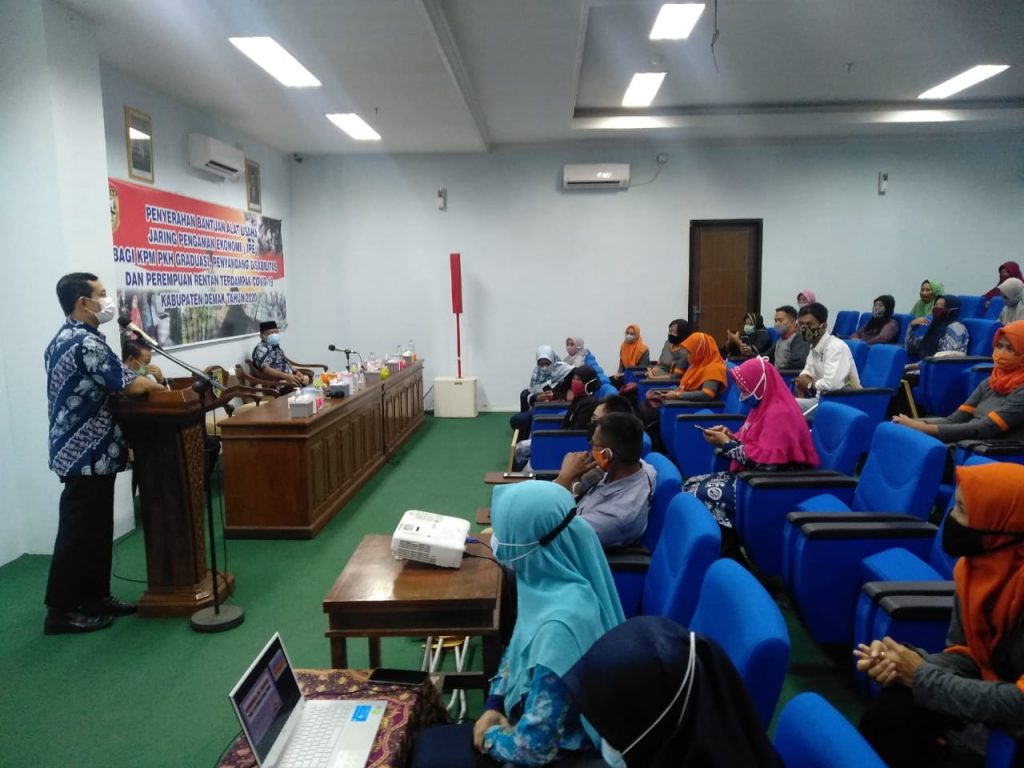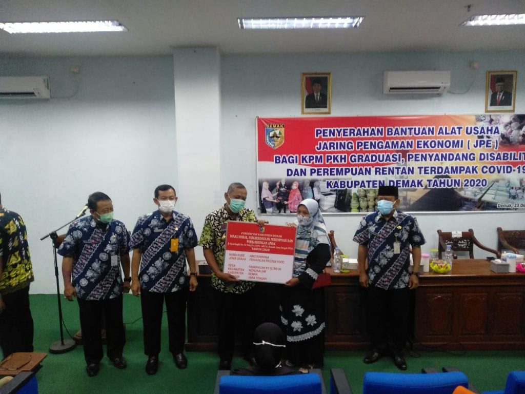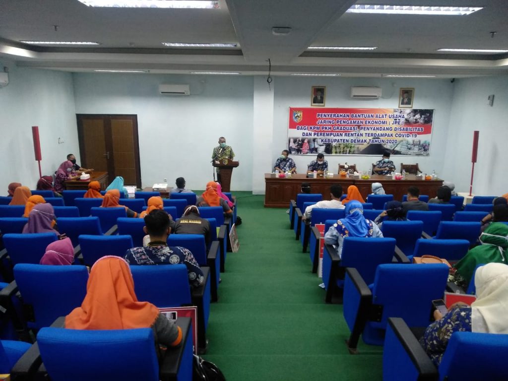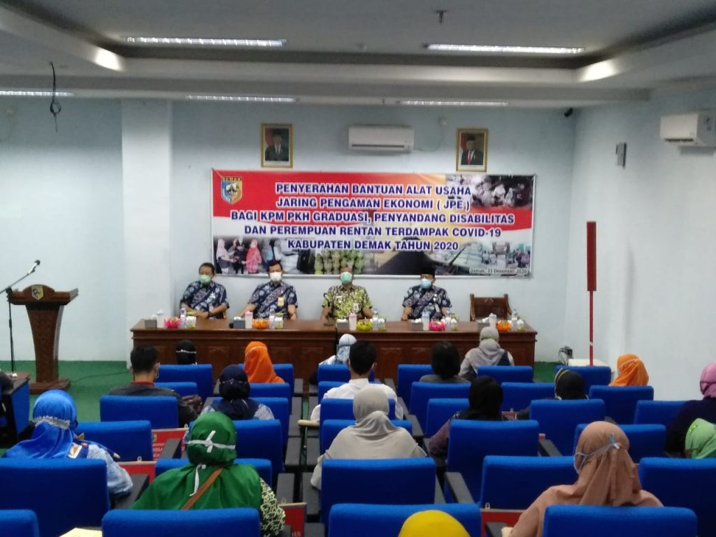 Penyerahan Bantuan Alat Usaha Jaring Pengaman Ekonomi (JPE) Bagi KPM PKH Graduasi, Penyandang Disabilitas Dan Perempuan Rentan Terdampak COVID-19 Kabupaten Demak TAHUN 2020 dilaksanakan hari Rabu tanggal 23 Desember 2020 oleh Dinas Sosial, Pemberdayaan Perempuan dan Perlindungan Anak Kabupaten Demak, bertempat di Ballroom Wakil Bupati lt 1 Kabupaten Demak dengan peserta 55 orang KPM PKH Graduasi, Penyandang Disabilitas Dan Perempuan Rentan Terdampak COVID-19.