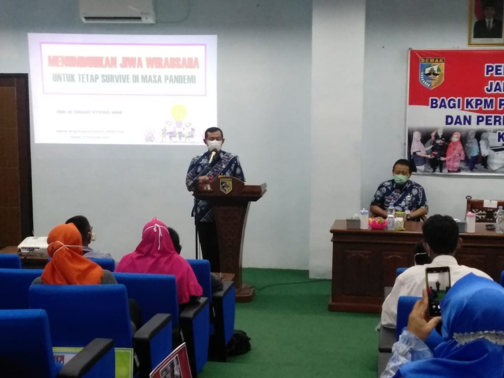 Narasumber bapak Sekretaris Daerah Kabupaten Demak (dr.Singgih Setyono,MMR) dengan Tema “Menumbuhkan Jiwa Wirausaha dengan Tetap Survive di masa Pandemi”. Dengan bantuan ini dari Dinas Sosial ini rata-rata membuka usaha baru itu yang berhasil hanya 5%, dibandingkan dengan waralaba keberhasilannya sampai 50-60%. Hutang pangkal rekoso, jangan banyak hutang, barang-barang yang ada dirumah yang tidak digunakan dapat dijual untuk melunasi hutangnya terlebih dahulu.