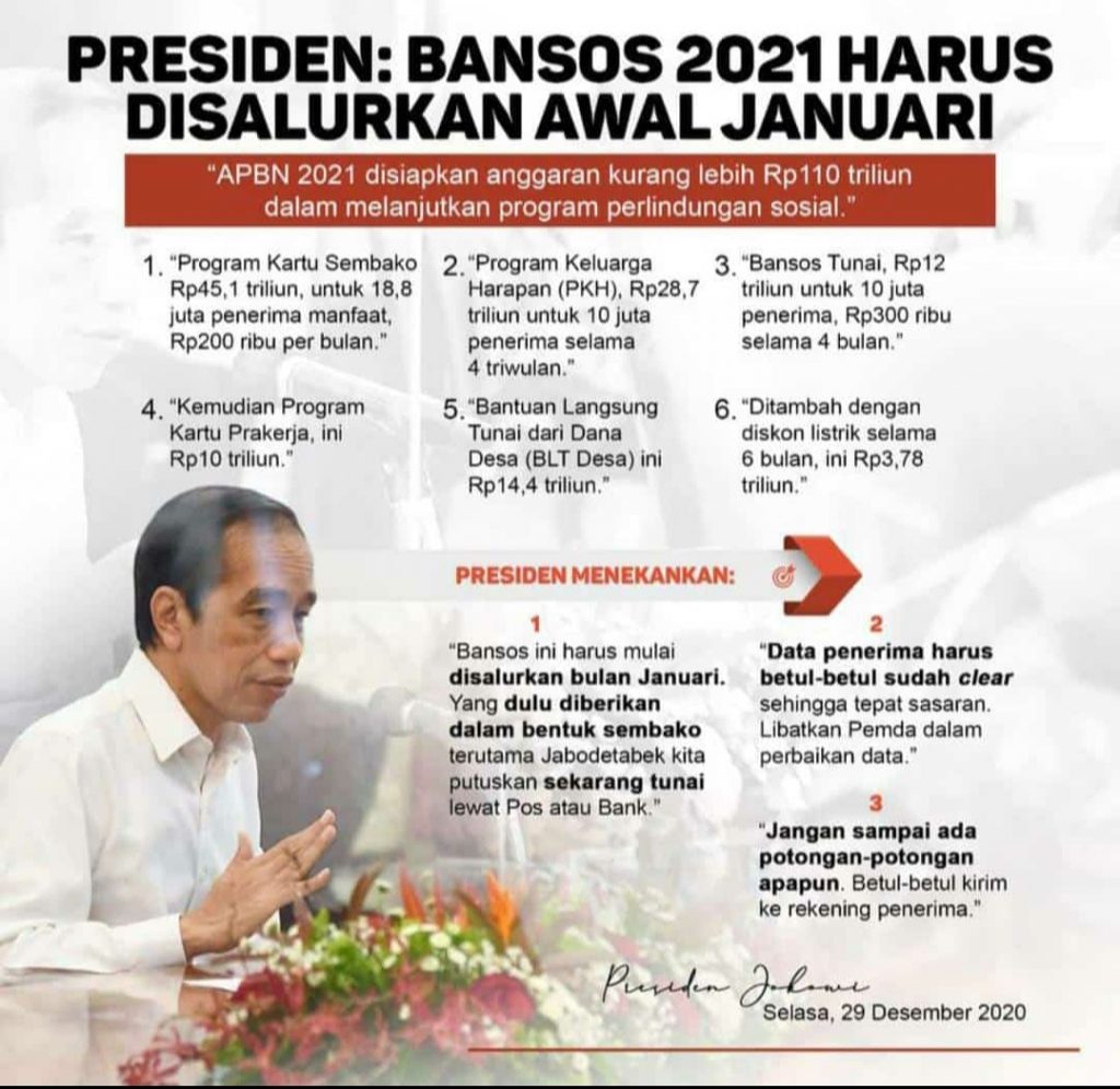 APBN 2021 disiapkan anggaran kurang lebih  Rp. 110 Triliun dalam melanjutkan program Perlindungan Sosial bagi masyarakat. Presiden menekankan Bansos ini harus mulai disalurkan bulan Januari, Data penerima harus betul-betul sudah clear hingga tepat sasaran  dan Jangan sampai ada potongan-potongan apapun.