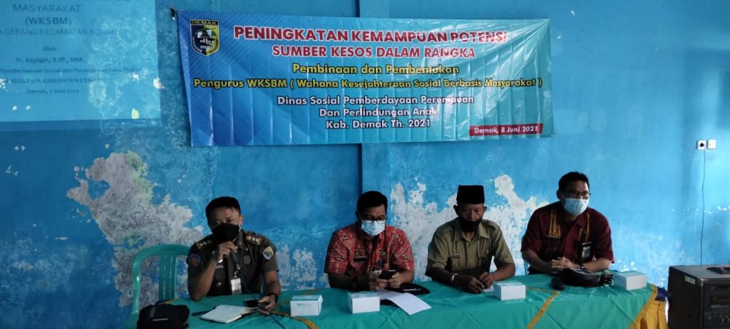 Pada Selasa, tanggal 8 Juni 2021 Bidang Pemberdayaan Sosial dan Penanganan Fakir Miskin pada Dinas Sosial, Pemberdayaan Perempuan dan Perlindungan Anak Kabupaten Demak dan Pelaksana Bidang Pemberdayaan Sosial dan Penanganan Fakir Miskin melaksanakan pembinaan dan pembentukan WKSBM (Wahana Kesejahteraan Sosial Berbasis Masyarakat) dalam rangka meningkatkan kinerjanya PSKS (Potensi Sumber Kesejahteraan Sosial) dalam penanganan PMKS (Penyandang Masalah Kesejahteraan Sosial) yang bertempat Di Aula Desa Gebang Kecamatan Bonang Kabupaten Demak. Yang dihadiri dari 3 Desa (Desa Gebang, Desa Karangrejo dan Desa Tlogoboyo Kecamatan Bonang)