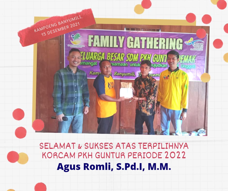 Rabu 15 Desember 2021 Bertempat di Kampoeng Banyumili, telah dilakukan pemilihan korcam 2022 PKH Kecamatan Guntur, dengan kandidat calon korcam dan terpilih Sdr. AGUS ROMLI,S.Pd,I,MM sebagai Korcam terpilih periode Tahun 2022, semoga amanah, yang juga disaksikan oleh Kordinator Kabupaten PKH Demak 1 dan Korkab PKH Demak 3.