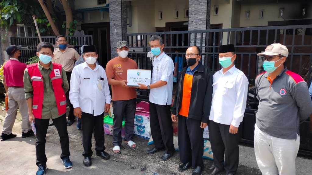 DEMAK-Pelaksanaan Pemberian bantuan kepada warga masyarakat yang Rumahnya terbakar pada hari Jum’at tanggal 4 Februari 2022 pukul 10.15 WIB oleh Tim Kebencanaan Kabupaten Demak, kepada Bapak SUTRISNO yang beralamatkan di Kampung Domenggalan Kelurahan Bintoro RT.08/RW.03 Kecamatan Demak Kabupaten Demak, yang disaksikan dari Kasi Kesra Kecamatan Demak, Kepala Kelurahan Bintoro beserta Jajarannya Kecamatan Demak, Relawan Tagana, Sibat PMI, relawan BPBD, Babinsa dari Koramil dan Babinkamtibmas dari Polsek. Tim Kebencanaan Kabupaten Demak terdiri dari Dinsos P2PA, PMI, BPBD dan BAZNAS.