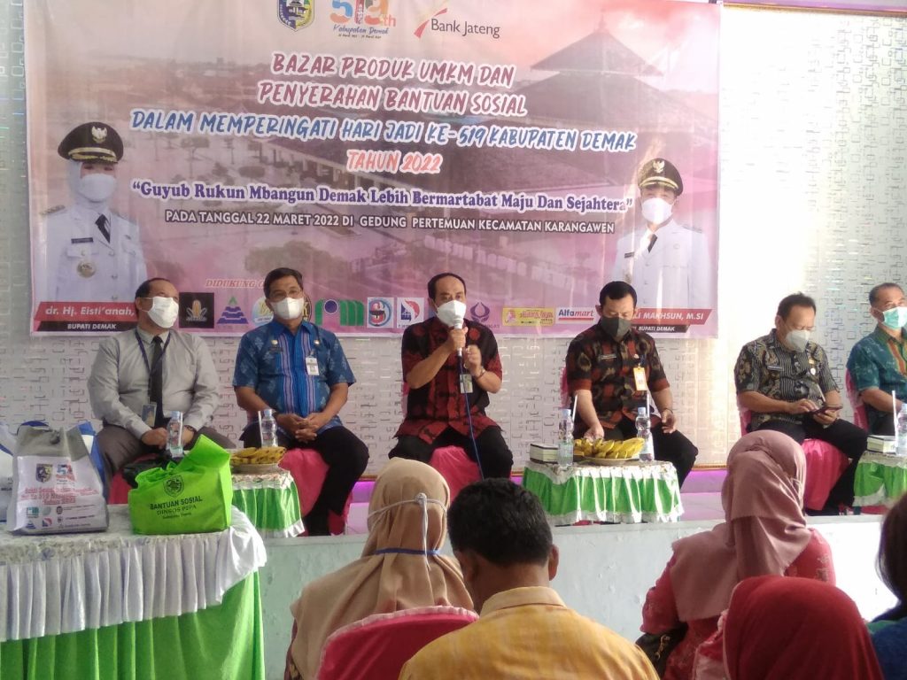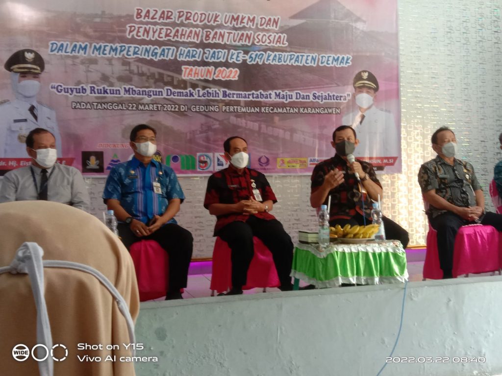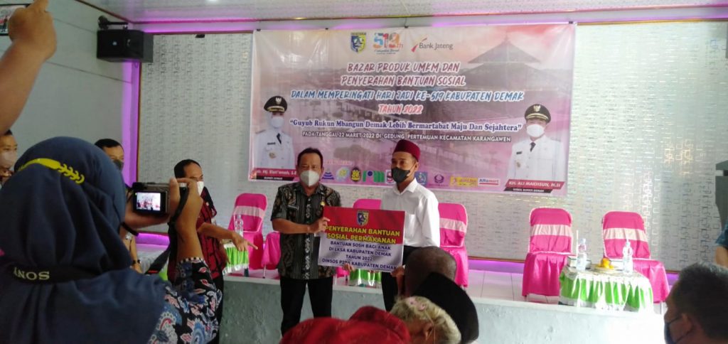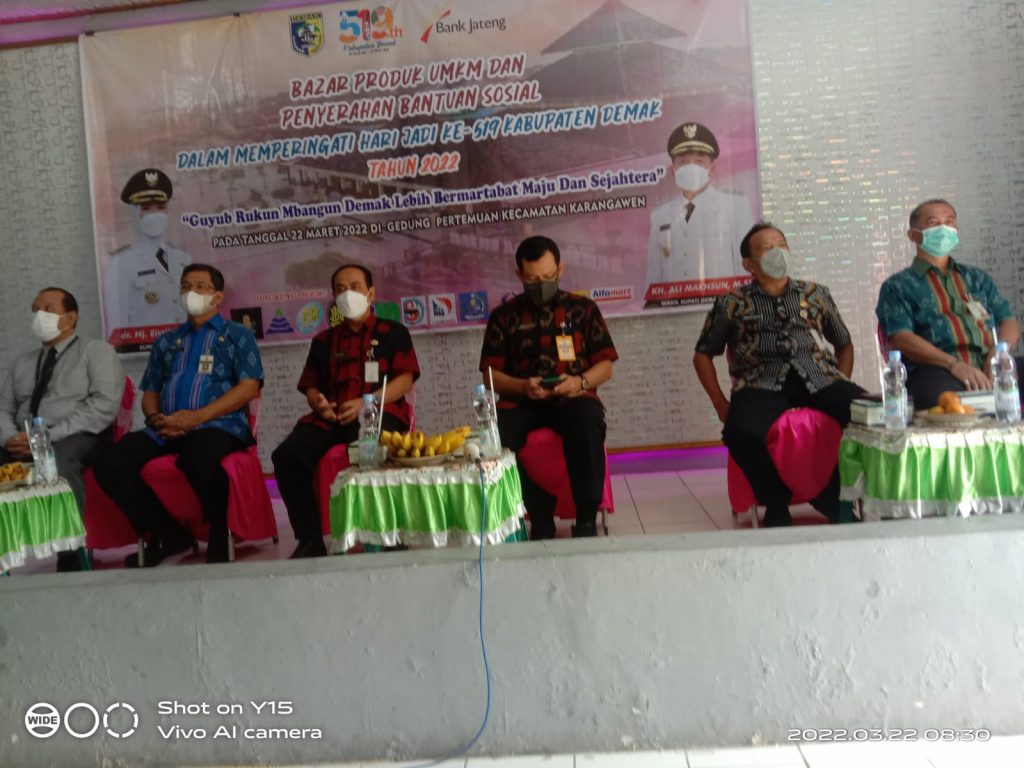 Koordinatar Kecamatan PKH dan Pendamping Sosial PKH Kecamatan Karangawen (DHANY SHINTO,S.Pd) Hari Selasa, 22 Maret 2022 pukul 08.40 WIB, bertempat di Aula Kecamatan Karangawen monitoring pelaksanaan Kegiatan Bazar Produk UMKM Kecamatan Karangawen dan Penyerahan bantuan untuk keluarga yang meninggal karena covid-19, lansia dan LKSA yang diberikan oleh Sekda Kabupaten Demak Bapak Singgih Setyono…acara berjalan dengan lancer, yang juga di hadiri Asisten 1 Sekda Kabupaten Demak, Kabag Perekonomian dan SDA Setda Kabupaten Demak, Forkompincam Kecamatan Karangawen.