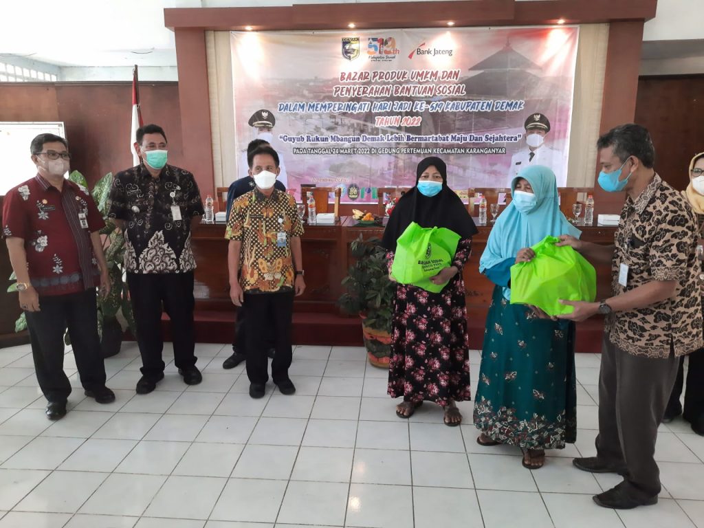 Pada Kamis 24 Maret 2022 pukul 09.00 WIB, Koordinatar Kecamatan PKH dan Pendamping Sosial PKH Kecamatan Karanganyar (MUKHLISHOH,AMK) memantau pelaksanaan kegiatan Bazar Produk UMKM dan penyerahan Bantuan Sosial bagi masyarakat kurang mampu, lanjut usia dan korban meninggal karena Covid-19, yang bertempat di Aula Kecamatan Karanganyar Kabupaten Demak, dalam rangka Memperingati Hari jadi Kabupaten Demak ke-519 di Kecamatan Karanganyar. Kegiatan tersebut dihadiri Plt. Kabag Perekonomian dan SDA Setda Kabupaten Demak (Arief Sudaryanto,S.Sos,M.Si), Camat Karanganyar, Forkompincam Kecamatan Karanganyar, tamu undangan, peserta bazar, serta pengunjung bazar. Kegiatan berjalan lancar dan berlangsung meriah.