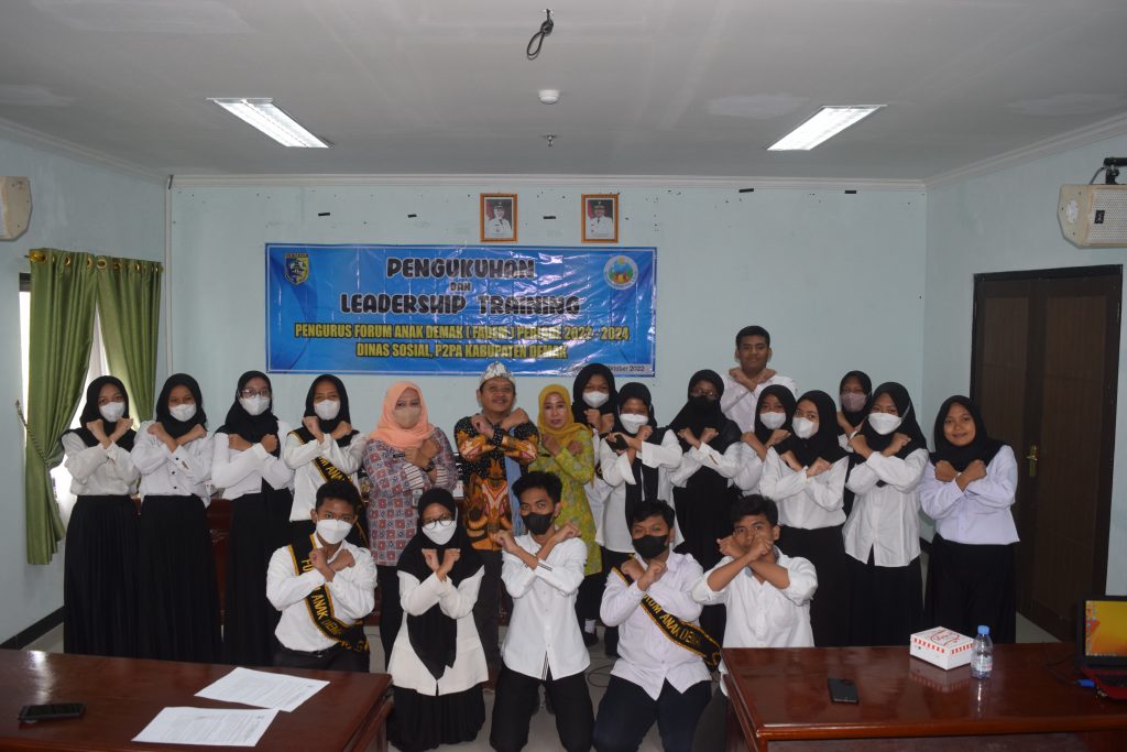 Pelaksanaan kegiatan oleh Subkoor KHA Siti Lestariyanti, SE,MM. Kegiatan dalam rangka Pengukuhan Dan Leadership Training Pengurus Forum Anak Demak Periode 2022-2024 yang dilaksanakan di Ruang Rapat Wakil Bupati Demak Lt. 2. Dengan Peserta 45 siswa-siswi serta Kepala Sekolah perwakilan dari beberapa Sekolah di Kabupaten Demak. Kegiatan yang dihadiri secara langsung oleh Bupati Demak dr. Hj. Eistianah, S.E dan Pj. SEKDA sekaligus sebagai Kepala DINSOS P2PA Kab. Demak Drs. Eko Pringgolaksito, M.Si .Dihadiri juga Plt. Kabid P2PA Maftukhah Kurniawati, SH.MH serta Narasumber/Pemateri Yuli Sulistiyanto dari Yayasan Setara Semarang.