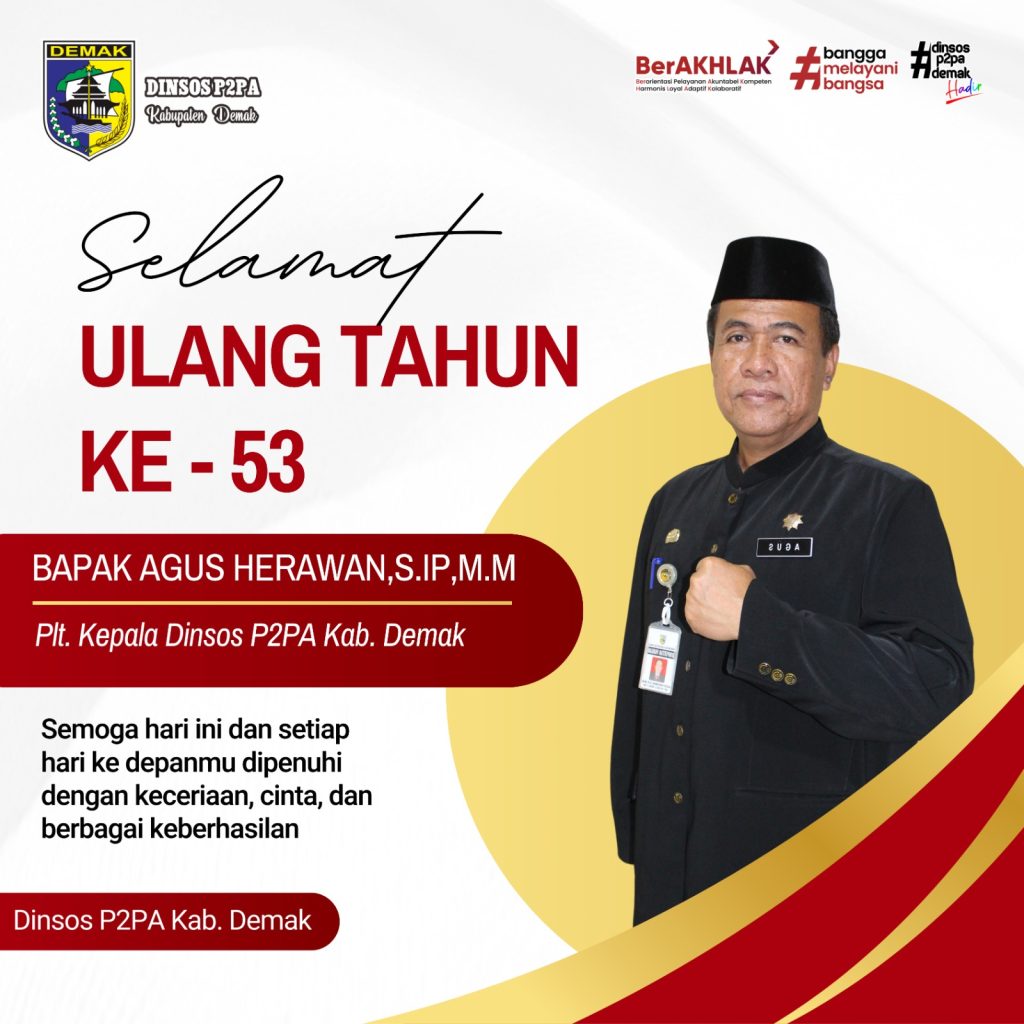 Dinas Sosial Pemberdayaan Perempuan dan Perlindungan Anak Kabupaten Demak mengucapkan selamat Hari Jadi Kabupaten Demak yang ke 421 pada tanggal 28 Maret 2024 ini. Pada Upacara HUT kabupaten Demak, Bupati Demak Dr.Hj.Eisti’anah, S.E menyampaikan bahwa tema pada HUT tahun ini adalah Semangat Kuat, Melangkah Pasti Menuju Demak Bermartabat, Maju dan Sejahtera.