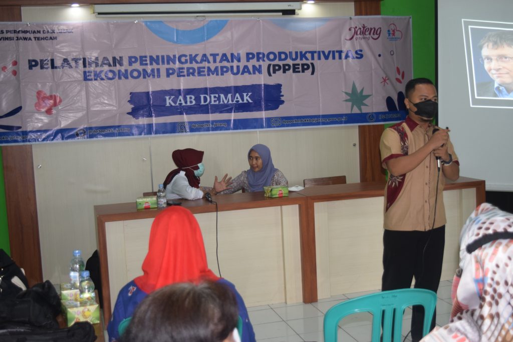 Bidang Pemberdayaan Perempuan dan Perlindungan Anak (P2PA) Kabupaten Demak. Bersinergi bersama Dinas Pemberdayaan Perempuan ,Perlindungan Anak, Pengendalian Penduduk dan Keluarga Berencana (DP3AP2KB) Prov. Jawa Tengah. Melaksanakan kegiatan Dalam Rangka Pelatihan Peningkatan Produktivitas Ekonomi Perempuan (PPEP) Tahap 2 Kabupaten Demak Tahun 2021 di Desa Kebonbatur Kec. Mranggen. Bertempat di Ruang Aula Balai Desa Kebonbatur dengan menghadirkan 20 orang peserta sesuai kriteria yang telah ditentukan dengan pioritas peserta Perempuan Kepala Keluarga (PEKKA) yang suaminya meninggal karena Covid 19. Pelaksanaan kegiatan dibuka oleh Sekretaris Desa Kebonbatur, dilanjutkan dengan Laporan Penyelenggara dari Kepala DP3AP2KB Prov. Jawa Tengah yang dibacakan oleh ibu Nurul dan Pemberian arahan serta materi dari Kepala DINSOS P2PA Kab. Demak (Drs. Eko Pringgolaksito, M.Si) dengan penyampaian Materi Usaha Pemerintah Kabupaten Demak Dalam Memberdayakan Ekonomi Perempuan.